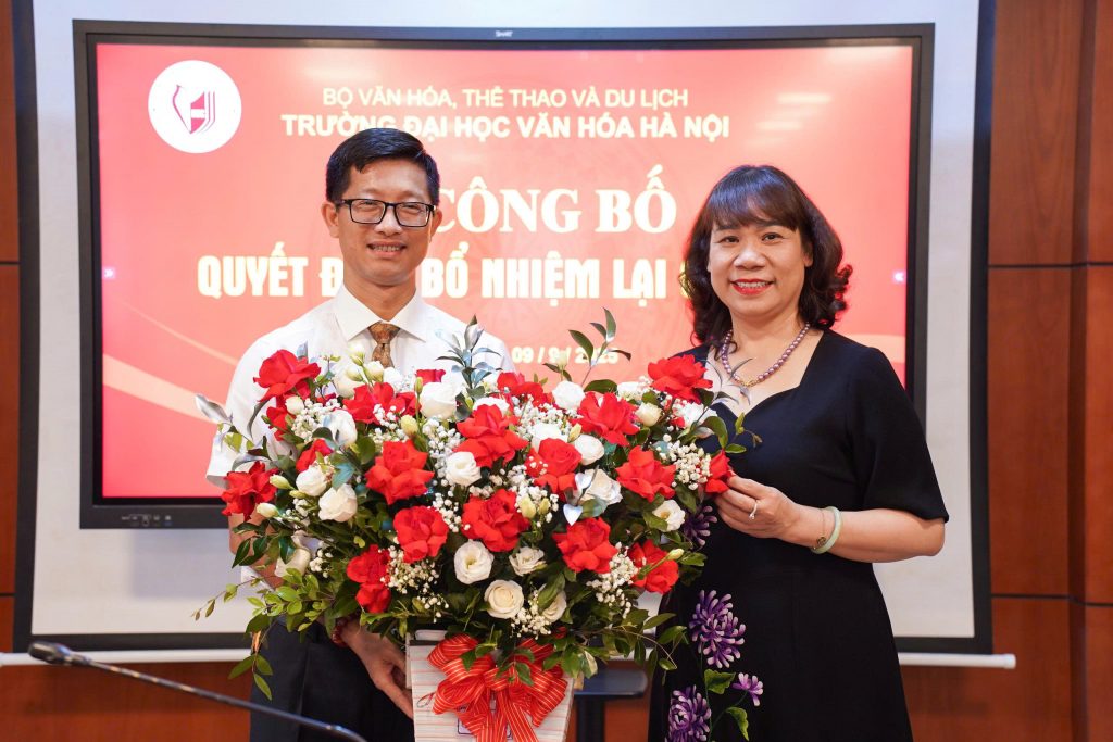 Tại buổi lễ, sau khi ThS. Hà Thị Thu Hà công bố quyết định bổ nhiệm lại cán bộ, PGS. TS. Phạm Thị Thu Hương đã thay mặt lãnh đạo Nhà trường trao quyết định cho TS Nguyễn Hữu Nghĩa và TS Đỗ Thị Thu Thuỷ. Hiệu trưởng Nhà trường đánh giá cao quá trình công tác và bày tỏ tin tưởng, với kinh nghiệm của mình, các cán bộ lãnh đạo được bổ nhiệm lại ngày hôm nay sẽ luôn hoàn thành tốt nhiệm vụ được giao, tiếp tục đóng góp, cống hiến cho Trường Đại học Văn hóa Hà Nội.